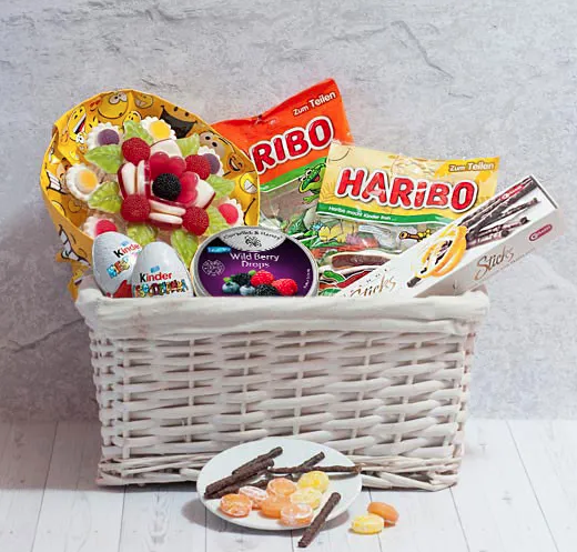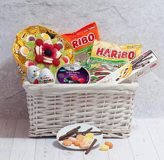 Żelki Haribo wiśniowe (175g) Cukierki Cavendish & Harvey owoce leśne bezcukrowe (175g) Żelki Haribo żabki (200g) 2x Jajko niespodzianka Kinder (20g) Paluszki czekoladowe Carletti pomarańczowe (75g) Bukiet żelkowy mix smaków (160g) Koszyk wiklinowy wykładany materiałem