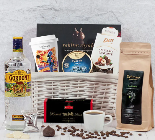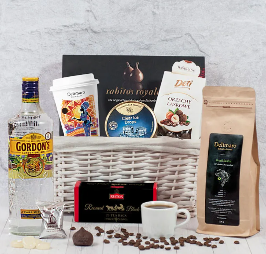 Kubek z czekoladą do picia Delimaro (150g) Herbata Riston Rasavat Black Tea 25 saszetek (50g) Kawa ziarnista Delimaro™ 100% Arabika Brasil Santos (250g) Dropsy Cavendish & Harvey lodowe (175g) Orzechy laskowe w czekoladzie z kawą Doti (100g) Figi w czekoladzie Rabitos Royale (125g) Gin Gordon's 37,5% (0,7l) Koszyk wiklinowy wykładany materiałem