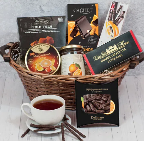 Herbata Riston English Breakfast (25 torebek) Dżem czerwona pomarańcza sycylijska 360 g Skórka pomarańczy w czekoladzie deserowej Delimaro™ (100g) Dropsy Cavendish & Harvey multiwitamina (175g) Czekolada gorzka (57%) Cachet pomarańczowo-migdałowa (100g) Trufle Excelcium kakao (150g) Paluszki czekoladowe Carletti pomarańczowe (75g) Koszyk wiklinowy brązowy